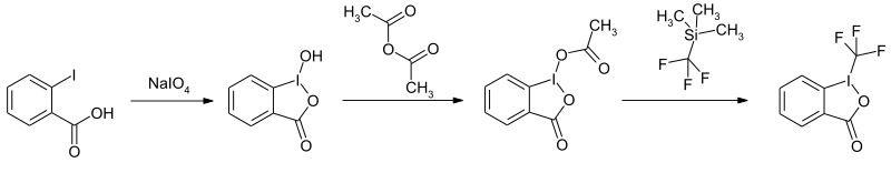 該合成包括三個(gè)步驟。在xxx步中,2-碘苯甲酸被高碘酸鈉氧化并環(huán)化為1-羥基-1,2-苯并碘酚-3(1H)-酮。然后通過(guò)與醋酸酐的?;磻?yīng)和隨后與三氟甲基三甲基硅烷的取代反應(yīng)可以得到目標(biāo)化合物。